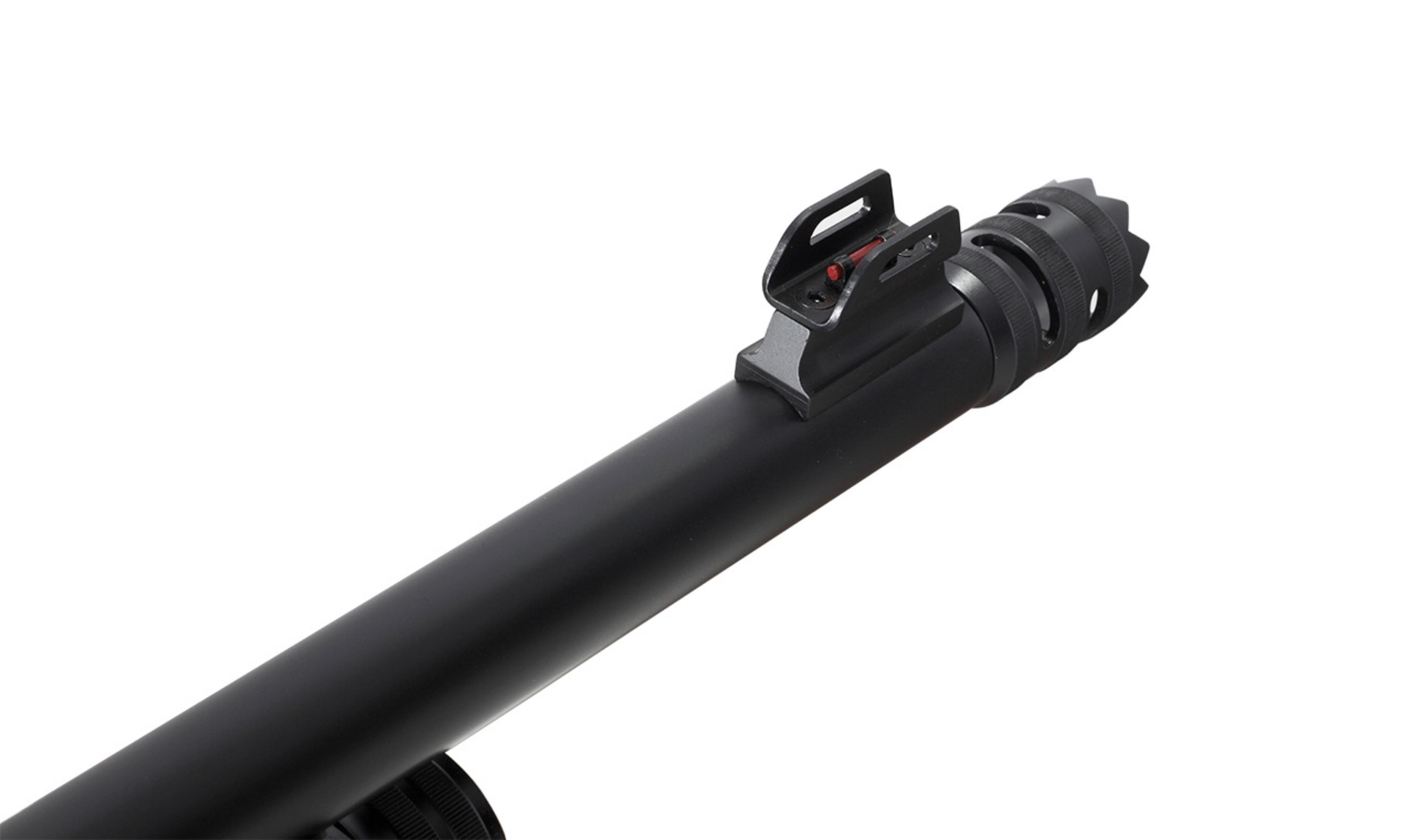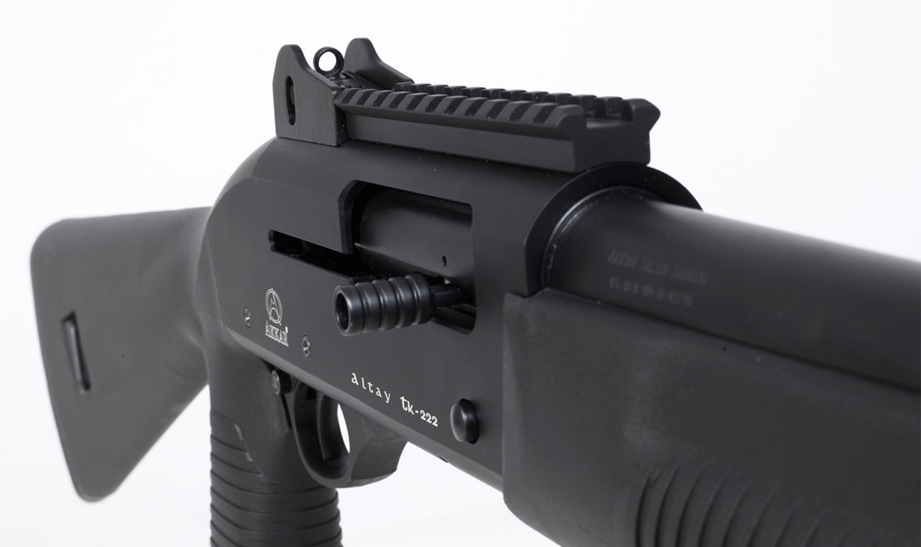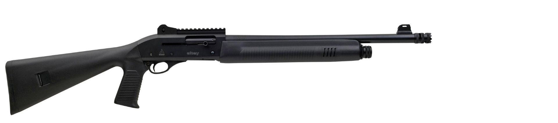 12-3" 47cm barrel, Pistol grip stock, Ghost ring sight, Picatinny rail, Breacher tube